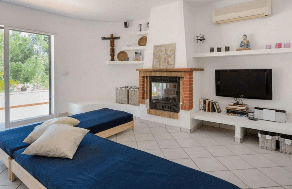 - Zona de Día: Un gran salón-comedor equipado con chimenea y zona de TV, ideal para crear un ambiente acogedor «boho-chic» tras una reforma.