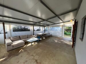 - Covered Porch (41 m²): Attached to the main warehouse is a covered porch structure that doubles the usable space. It is the ideal spot for outdoor meals, sorting harvests, or providing shade for light machinery.