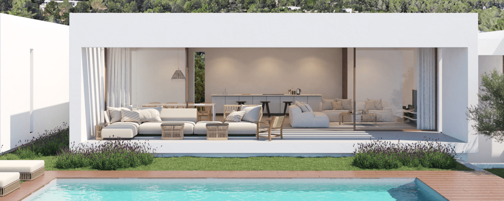 El proyecto ha sido concebido bajo una estética minimalista moderna, diseñada para mimetizarse con el entorno rústico de Ibiza sin renunciar a las líneas limpias y los espacios abiertos que definen el lujo contemporáneo.